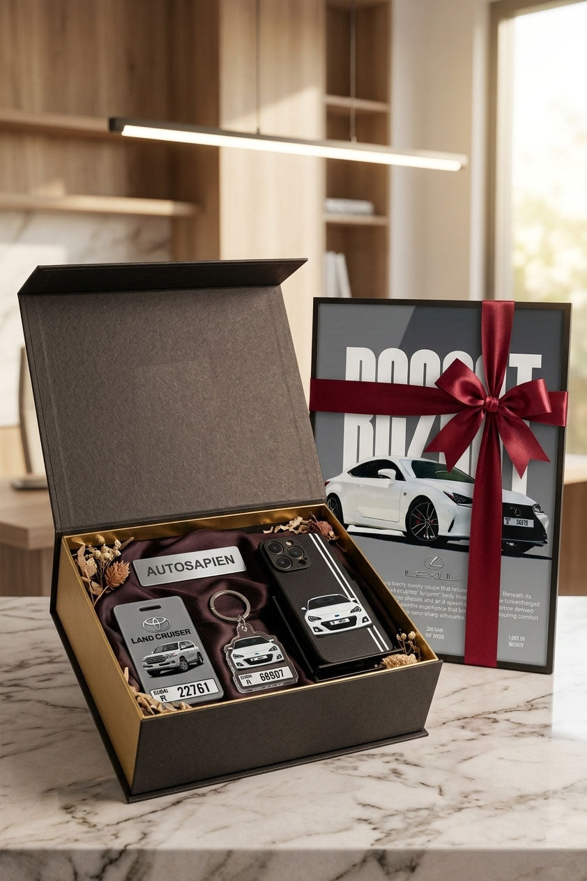 Surprise your favorite automotive enthusiast with the ultimate curated gift box, a premium collection designed to celebrate a life lived in the fast lane. This high-end bundle features a selection of precision-crafted essentials, including a sleek metal interior badge, a designer phone case with minimalist vehicle graphics, and a custom acrylic keychain and hang-tag set. Each piece is meticulously detailed to reflect a passion for automotive design, from the rugged textures of the accessories to the high-definition vector art. To complete the experience, a large-scale, professionally framed automotive poster is included—elegantly wrapped with a signature bow—all presented in a luxurious, gold-lined gift box that makes for an unforgettable unboxing.